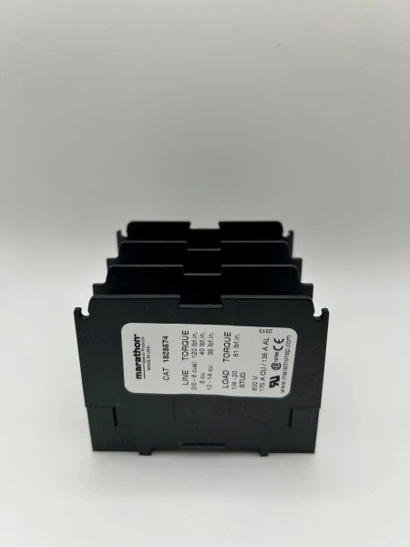 Marathon Special Products terminal blocks are high-quality, reliable electrical components used to secure and organize electrical wiring in various industrial, commercial, and residential applications. These terminal blocks are designed to simplify wiring connections, provide electrical safety, and enhance the efficiency of electrical systems. Marathons 1323574 is a distrubtion block with 1 in and 1 stud out. It has a wire range on the line side is (1) 2/0 - #14 AWG and on the load side is 1/4 - 20 X 1/2 stud. It is rated for up to 175A and 600V. The terminal block is rated 10,000A short circuit current. The insulation material is thermoplastic and connector is aluminum, tin plated. This 1323574 distribution block is RoHS complaint.