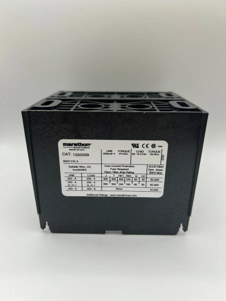 Marathon Special Products terminal blocks are high-quality, reliable electrical components used to secure and organize electrical wiring in various industrial, commercial, and residential applications. These terminal blocks are designed to simplify wiring connections, provide electrical safety, and enhance the efficiency of electrical systems. Marathons 1332559 is a distrubtion block with 1 in and 1 stud out. It has a wire range on the line side is (1) 350kcmil - #6 AWG and on the load side is 3/8 X 16 X 1 1/4 stud. It is rated for up to 310A and 600V. The terminal block is rated 10,000A short circuit current. The insulation material is thermoplastic and connector is aluminum, tin plated. This 1332559 distribution block is RoHS complaint.