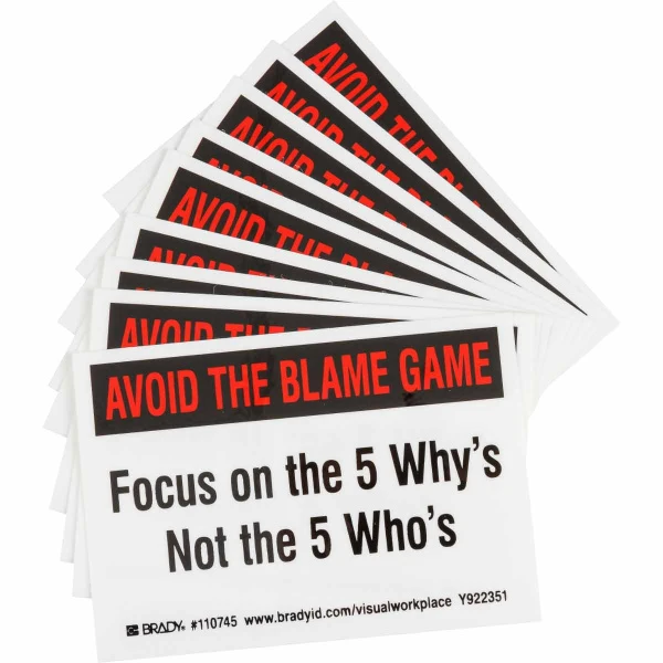 AVOID THE BLAME GAME FOCUS ON THE 5 WHY'S NOT THE 5 WHO'S Labels, 3.5" H x 5" W x 0.006" D, Black/Red on White