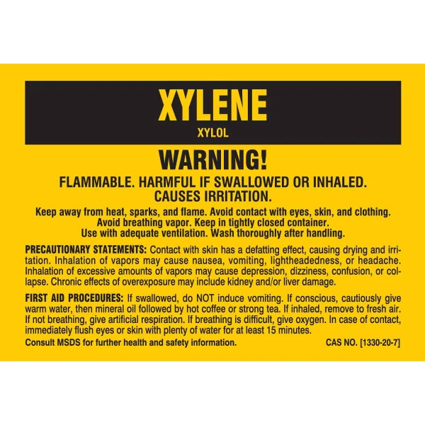 XYLENE XYLOL WARNING! FLAMMABLE. HARMFUL IF SWALLOWED OR INHALED. CAUSES IRRITATION, 2" H x 5" W, Black on Yellow, Pack of 25 Labels