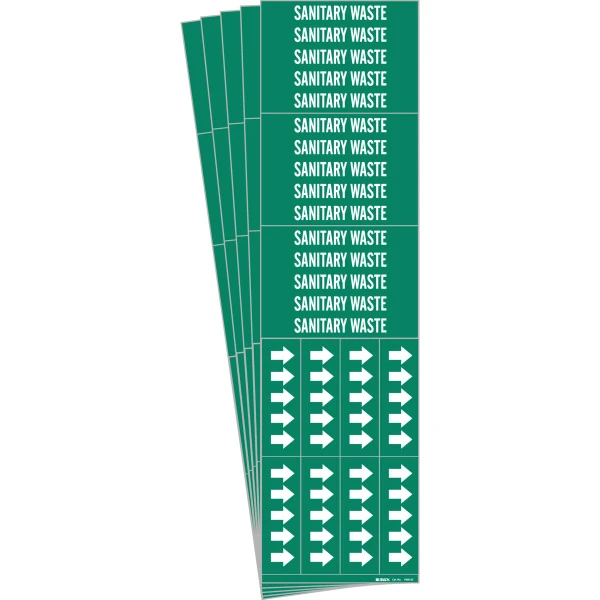 SANITARY WASTE Pipe Marker Style 3C with Arrows White on Green 3 per Card, 5 PK