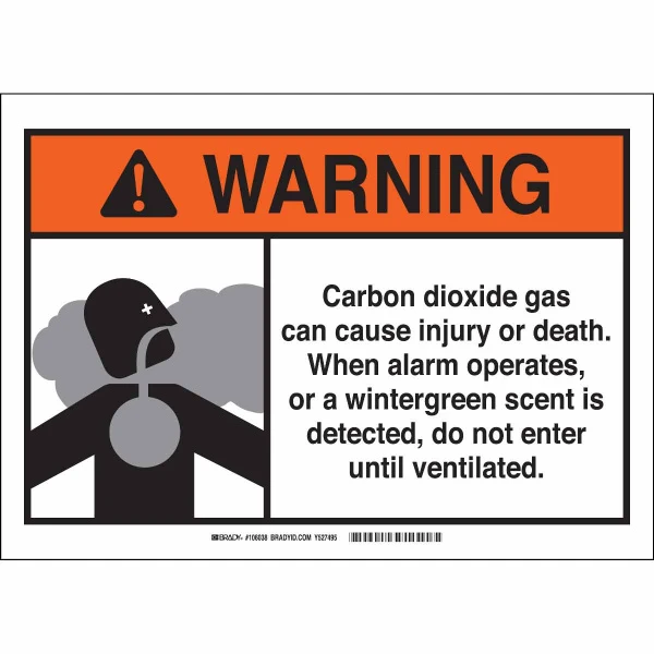 WARNING Carbon Dioxide Gas Can Cause Injury Or Death. When Alarm Operates, Or A Wintergreen Scent Is Detected...Sign, 10" H x 14" W x 0.035" D