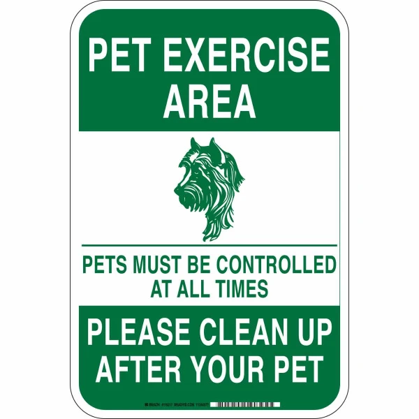 Pet Exercise Area Pets Must Be Controlled At All Times Please Clean Up After Your Pet Sign, 18" H x 12" W x 0.035" D, Aluminum