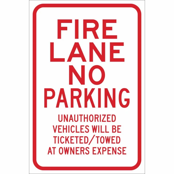 Fire Lane No Parking Unauthorized Will Be Ticketed/Towed At Owners Expense Sign, 18" H x 12" W x 0.090" D, Red on White