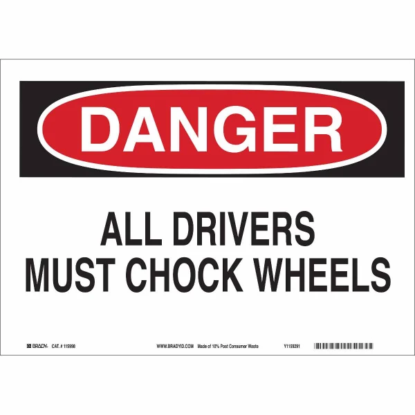 DANGER All Drivers Must Chock Wheels Sign, 10" H x 14" W x 0.004" D, Plastic