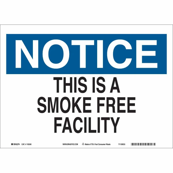 NOTICE This Is A Smoke Free Facility Sign, 10" H x 14" W x 0.004" D, Plastic