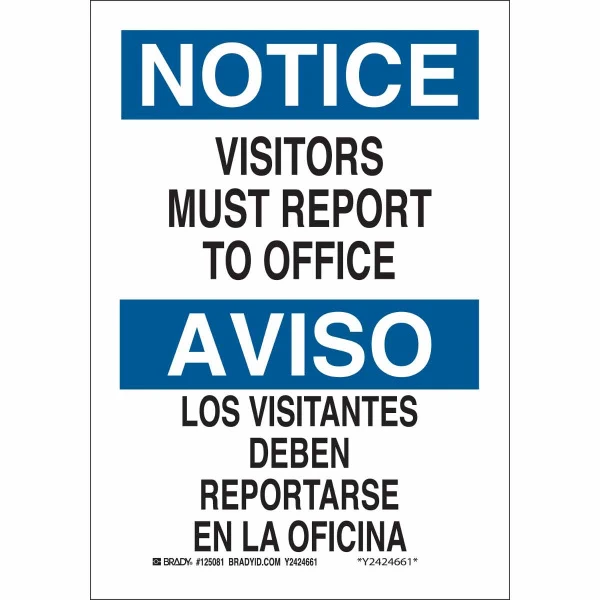 Bilingual NOTICE Visitors Must Report To Office Sign, 14" H x 10" W x 0.06" D, Polystyrene