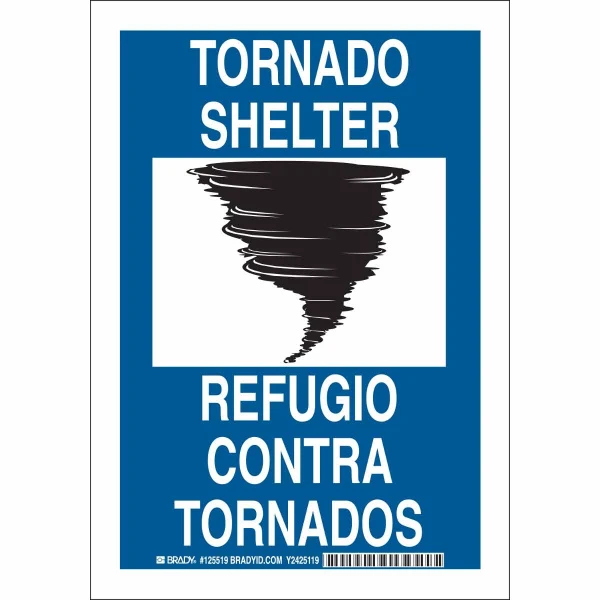 Bilingual Tornado Shelter Sign, 14" H x 10" W x 0.006" D, Black/White on Blue, Polyester