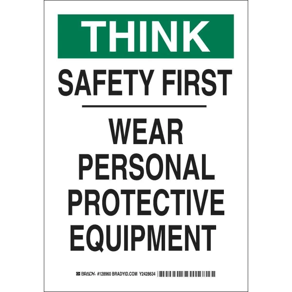 THINK Safety First Wear Personal Protective Equipment Sign, 10" H x 7" W x 0.035" D, Aluminum