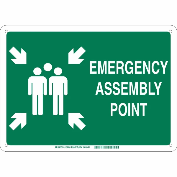 Emergency Assembly Point Sign, 14" H x 20" W x 0.1" D, Green on White, Fiberglass, Pictogram w/Arrows and Text