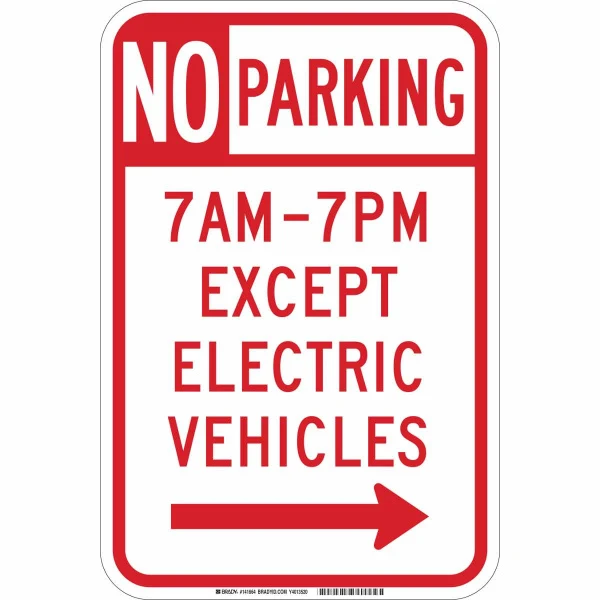 No Parking 7Am-7Pm Except Electric Vehicles Sign, 18" H x 12" W x 0.090" D, Aluminum, Arrow Direction Right