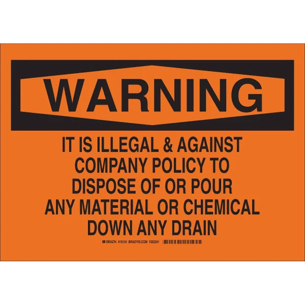 WARNING It Is Illegal & Against Company Policy To Dispose Of Or Pour Any Material Or Chemical Down Any Drain Sign, 10" H x 14", Polyester