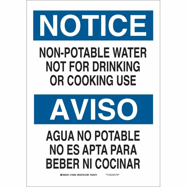 Bilingual NOTICE Non-Potable Water Not For Drinking Or Cooking Use Sign, 14" H x 10" W x 0.06" D, Polystyrene, 14" H x 10" W, Polystyrene