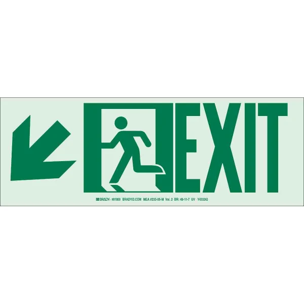 BradyGlo NYC Approved Exit With Running Man And Down/Left Arrow Sign, 5" H x 14" W x 0.0096" D