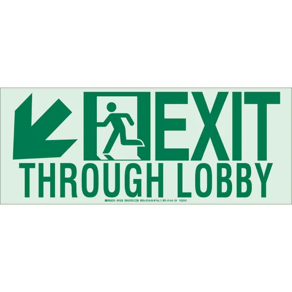 Exit Through Lobby Sign, 7" H x 18" W x 0.045" D, Arrow Direction: Diagonal Down/Left