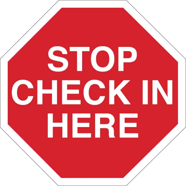 Stop Check In Here Sign, 11" H x 11" W x 0.06" D, White on Red