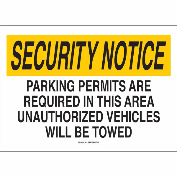 SECURITY NOTICE Parking Permits Are Required In This Area Unauthorized Vehicles Will Be Towed Sign, 14" H x 20" W x 0.06" D, Black/Yellow on White