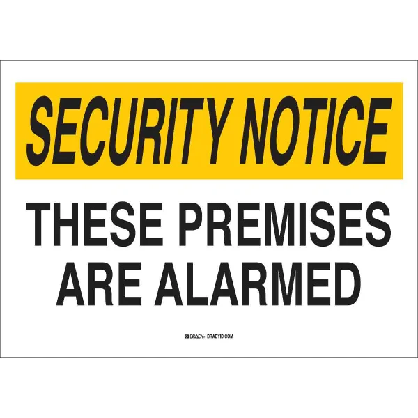 SECURITY NOTICE These Premises Are Alarmed Sign, 14" H x 20" W x 0.06" D, Black/Yellow on White