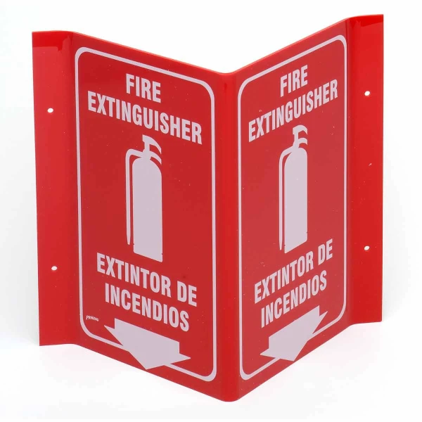 Bilingual V Fire Extinguisher Sign, 11" H x 12" W x 5" D, White on Red, Acrylic